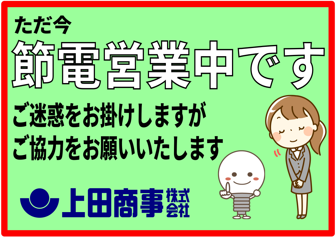 ただいま当店は節電営業を実施しております店内の照明が従来よりも暗くなっておりますお客様にはご迷惑をお掛けいたしますのがご協力をお願いいたします