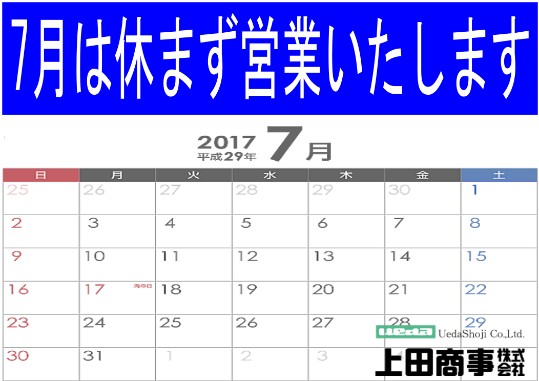 7月は5・6月に引き続き休まず営業致します土日祝日も平日と同じ朝8:00から夜6:00までの営業時間となってます皆様のお越しを心よりお待ち致しております※8月より日曜は定休日となりますのでお気を付け下さい